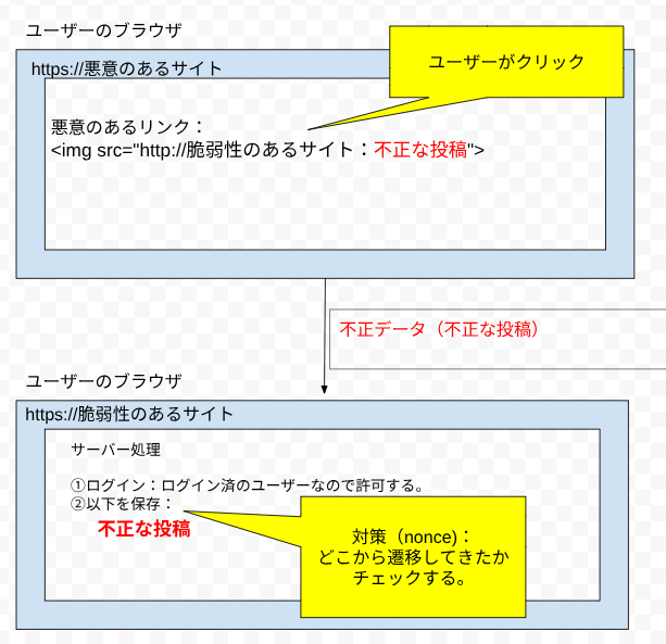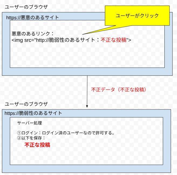 - 攻撃の起点(外部要素): 攻撃者が用意した不正なページ(サーバーへ不正な命令を送るHTMLコードが仕込まれる)。